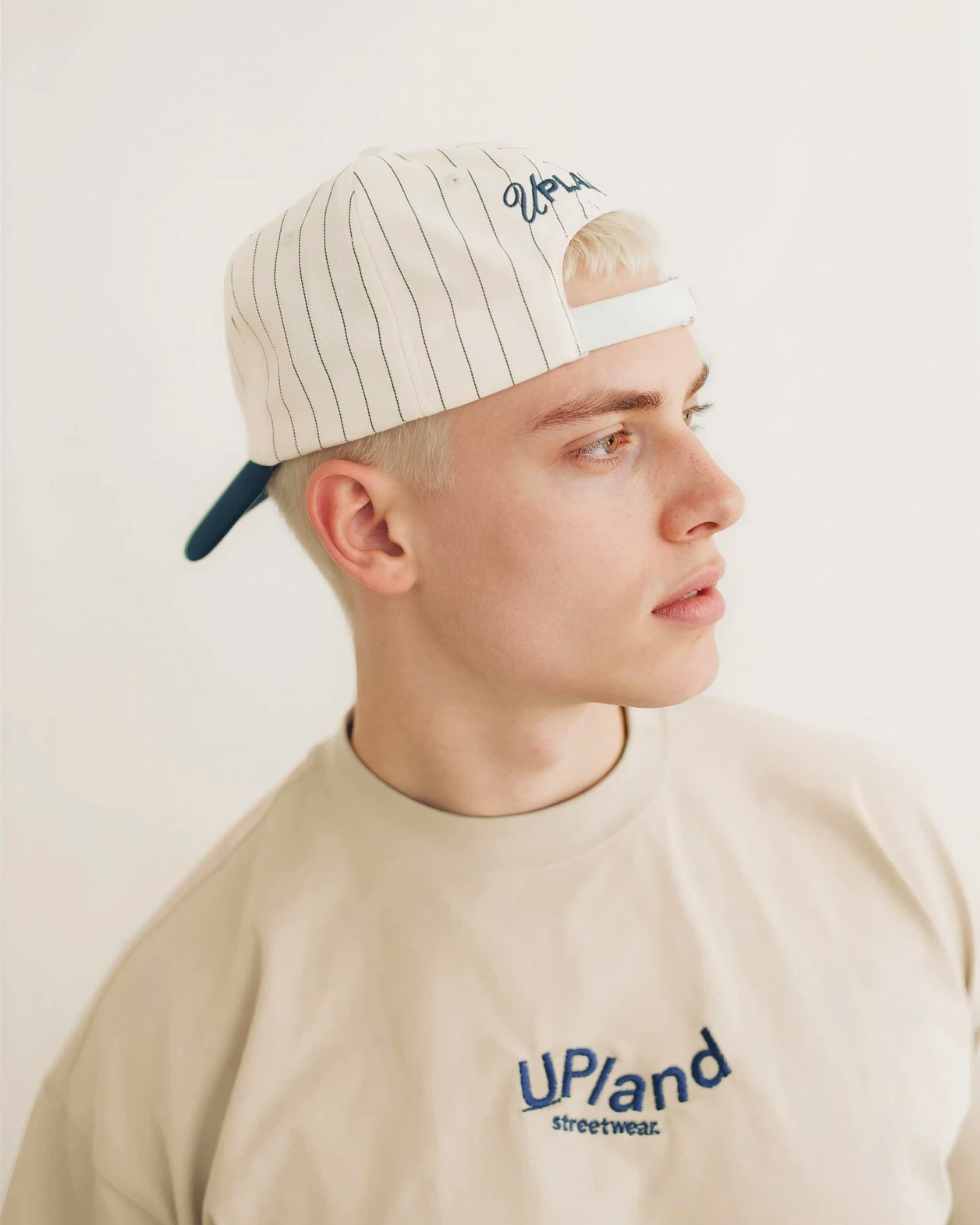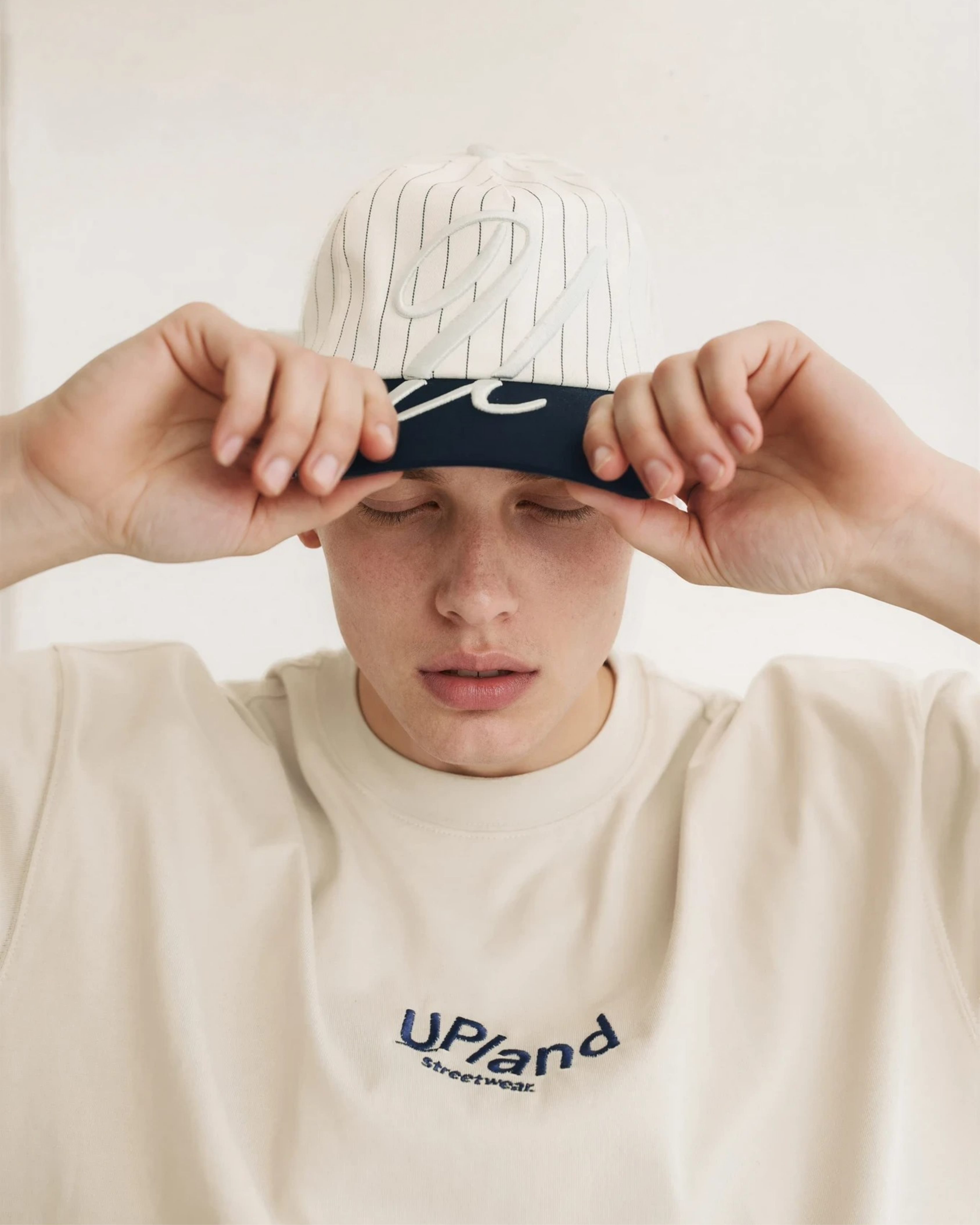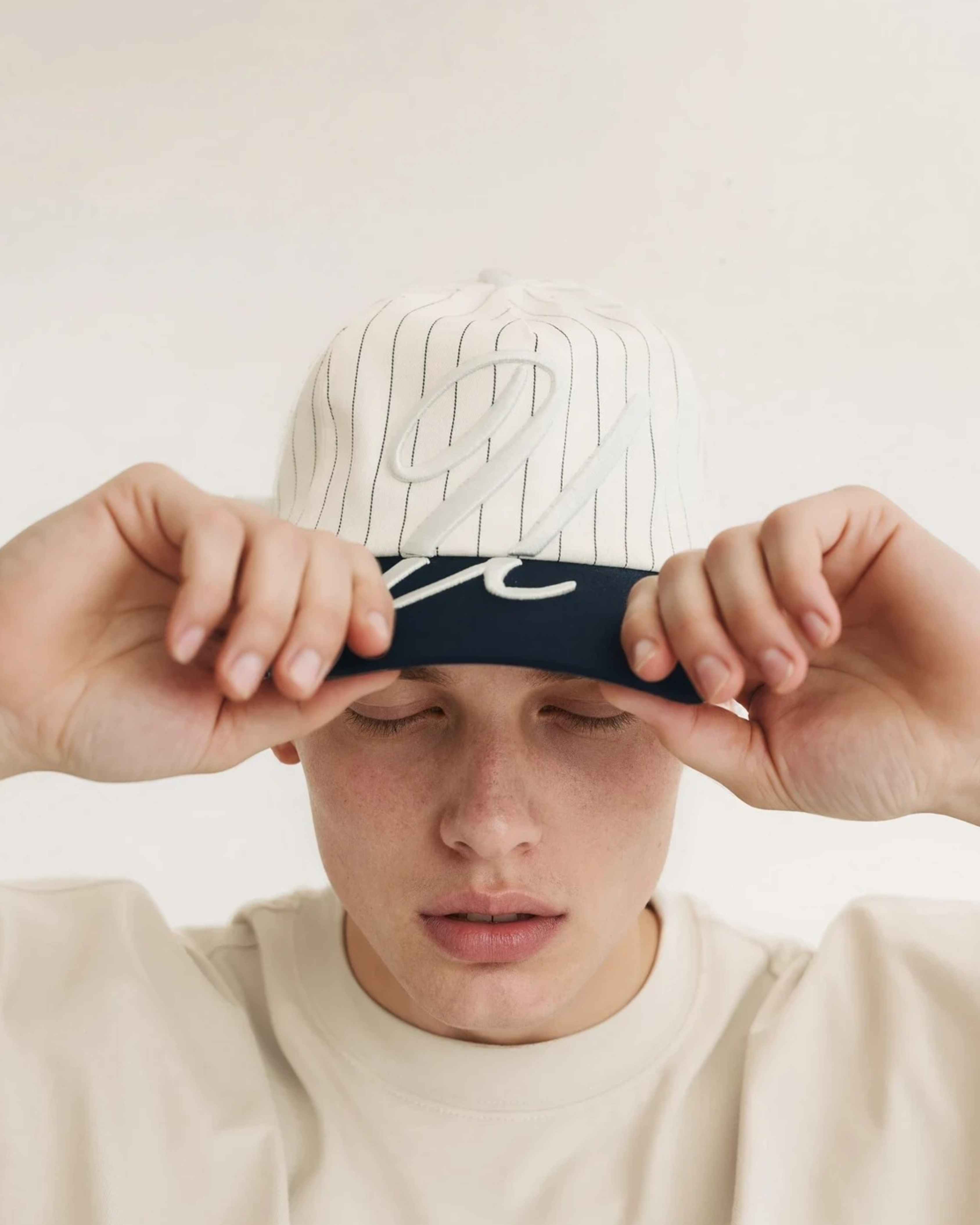 A classic silhouette with a bold, modern touch. This hat features a crisp white pinstripe crown contrasted by a deep navy brim, giving it a timeless, sports-inspired look. The oversized embroidered script on the front makes a strong statement, adding texture and depth without overdoing it.